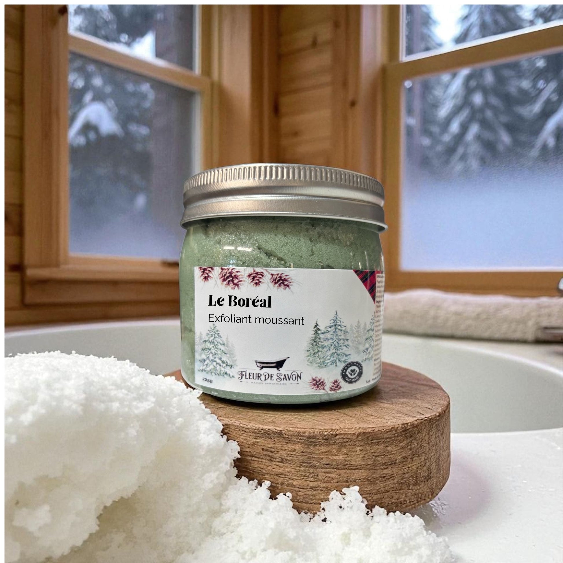 Notre exfoliant moussant Boréal nettoie et adoucit la peau tout en vous enveloppant d’une fragrance réconfortante.